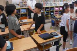 1~4年生の外国語活動や5・6年生の外国語の学習では、外国人のAETが話す英語を聞いたり、直接コミュニケーションをとったりして学習を進めています。この日は、4年生と5年生の教室で、いつもと違うAETとオンラインでつなぎ、Small Talkを聞いたり画面越しにコミュニケーションをとったりすることに挑戦しました。