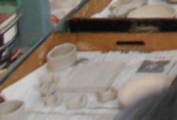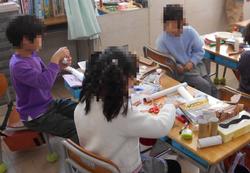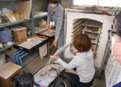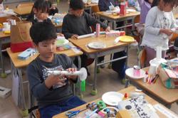 よつば組では、総合的な学習の時間に陶芸に挑戦している人がいます。この日は、これまで粘土で作ってきた作品を、素焼きのために焼き窯庫に入れていました。作品づくりでは、陶芸同好会の方に来ていただき、コツなどを教えていただきました。この日も焼き窯庫への入れ方を説明していただきました。