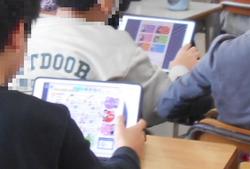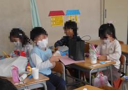 1年生が図工の学習で「スルスル ビューン」に取り組んでいました。これはクリップを斜めに張られた紐に引っ掛け、作った作品を滑らせるというものです。子どもたちは、作っては滑らせてみて、また飾りを付け加えたり色を加えたりしていました。