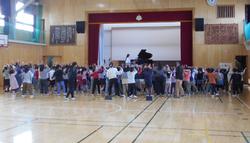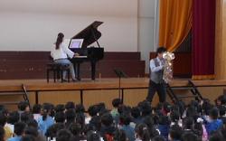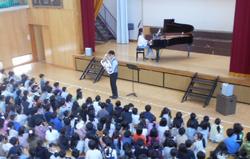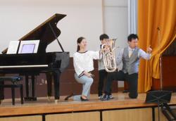 1・2・3年生が、音楽鑑賞を行いました。エバリーという音楽グループからお二人が来校し、ユーフォニアムという金管楽器とピアノでの演奏を聴かせていただきました。ユーフォニアムの指を押さえて演奏体験をさせてもらう場面もあり、楽器への関心が高まりました。楽しく体を動かしながら「音」を「楽」しむことができました。