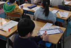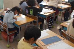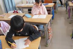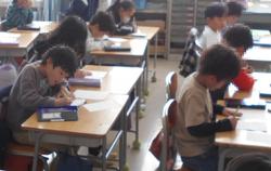 1年生と2年生は、各教室で硬筆での書き初めを行いました。1年生は「お正月」を、2年生は短い文章を書きました。 いつもとは違う雰囲気の中で緊張している様子もありましたが、一画一画を丁寧に書いていました。書き終わった用紙は台紙に貼り、きれいな飾り紙を付けました。