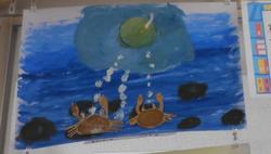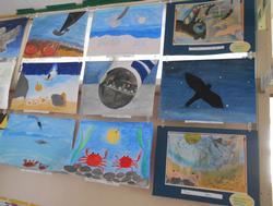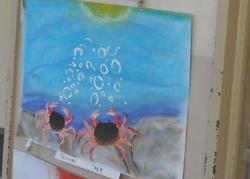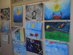 6年生の図工で取り組んだ絵が廊下に展示されています。宮沢賢治さんの作品を読んで、言葉からイメージしたこと感じとったことを、形や色、画面構成、表現方法を工夫して表しています。一つ一つの作品に工夫が感じられて、思わず見入ってしまいます。