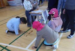 12月4日、1年生と2年生が人権集会の取組で、ボッチャの体験をしました。社会福祉協議会の方を通して、民生委員児童委員の方々に来ていただき、それぞれのグループに分かれてゲームの進行をしていただきました。