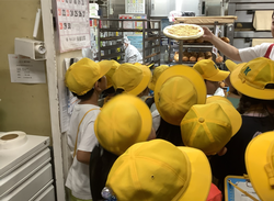 OKストアに見学に行きました。たくさん商品を売るための工夫について知るために、店長さんの話を聞いていました。
