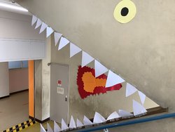 出来上がった作品は他学年の子ども達にも大好評で、「これなんだろう?」「あ!牙がついてるよ!」などと、その場に立ち止まって楽しく作品を鑑賞する姿が至る所で見られました。中には、「自分たちも、早くやってみたいな。」という声も。
