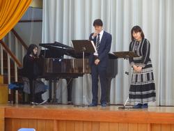 今年度は,國友 淑弘(くにとも よしひろ)さん、松浪 ゆの(まつなみ ゆの)さんのお二人にお越しいただき、合唱曲「この星に生まれて」をご指導してくださったり、お二人でデュエットしてくださったりと、とても有意義な時間になりました。