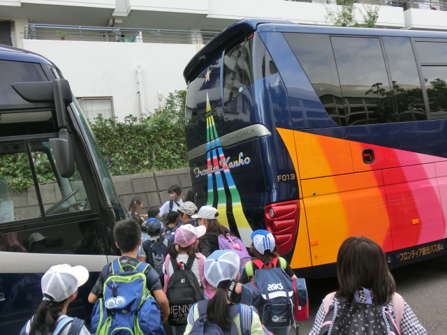 梅雨の雲間から太陽が覗いています。5年生は、みんな元気に3台の観光バスに乗り込みました。