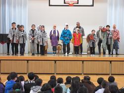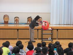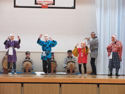 1年間、「校内安全」を見守ってくれた達磨に目が入り、お囃子クラブの演奏と舞が披露されました。丙午の一年での全校児童の様々な向上と安全、安心を願いました。