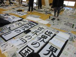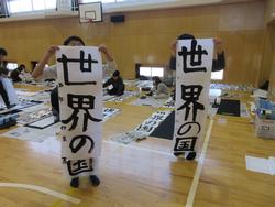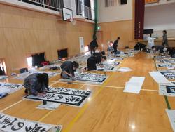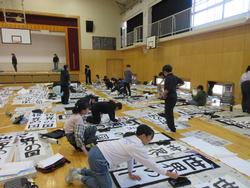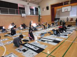 3、4年生、5、6年生が体育館で書初めを行いました。太筆を使って勢いのある字を書く児童たちです。1、2年生の硬筆の書初めを含め、1月25日12時~26日14時までの鐵神社「天神祭」の地域作品展に出品します。