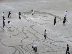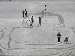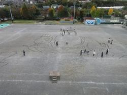 6年生が実物大の大仏の大きさを体感しようと、校庭に巨大な大仏を描きました。方眼用紙に大仏を描き、校庭に引いた方眼のマス目に沿って、曲線を描きました。一人ひとりがペットボトルに水を入れて、少しずつ線状に水で線を増やしていく。協力して作り上げた大仏の図でした。