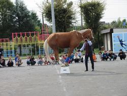 馬を運ぶ大きな「馬運車」が校庭に入り、サラブレッドとポニー合わせて4頭の馬が降り立ちました。ポニーたちは、芝生や草の上でとてもリラックスしていたそうです。騎手の方が騎乗して走る様子、馬が小さな台の上に4本足で立つ様子を見せていただき、各学年ごとに実際に馬に触れさせていただく機会を持ちました。初めて見る馬運車の中に入ったり、日ごろ馬が食べている餌を見学したりと、とても貴重な時間を過ごした鉄小の児童たちでした。