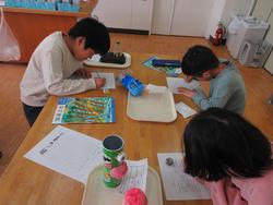 3年生図工、互いの作品を鑑賞し、感じたことを書き記します。
