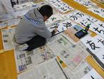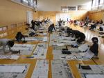 5、6年生が体育館で書初めを行いました。5年生は「世界の国」、6年生は「夢の実現」を堂々とした字形で書き上げました。書初めは、年が明けて初めて毛筆で文字や絵をかく行事です。字の上達を祈願する意味も込められています。