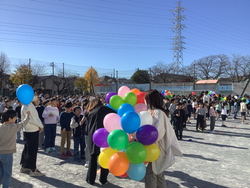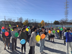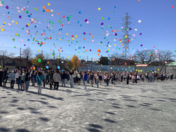 快晴の空の下、一人一つずつの風船が配られ、一斉に空に放つバルーンリリースを行いました。