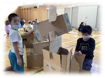 図工「クミクミックス」を行いました。たくさんの段ボールを様々な大きさに切り、組み合わせて作品をつくりました。体育館全体を使って、横に長くつなげたり、友達と協力して高くつなげてみたりと、工夫しながら取り組む姿が見られました。切れ込みの入れ方を工夫しないと、段ボール同士が上手くかみ合わないので調節の繰り返しでした。 |