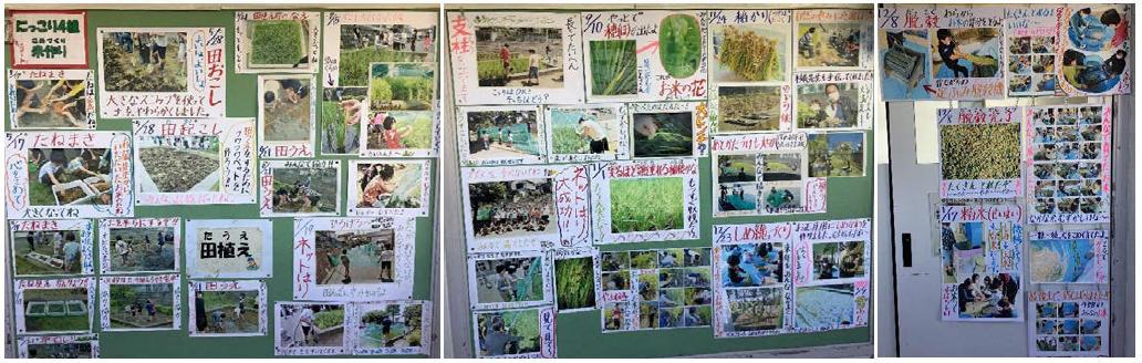 体育館前の田んぼを使って、1年を通して田起こしから収穫までを行いました。種は1か月ほどで苗に育ち、4組のみんなで協力しながら田植えを行いました。鳥よけのネットもみんなで協力しながら取り付けて、稲の成長を見守りました。9月には穂が出て、米の花を観察することもできました。