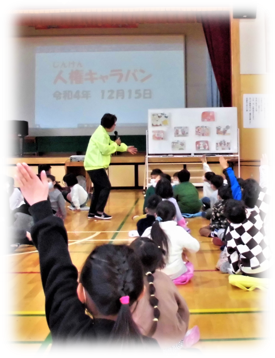 「人権キャラバン」では、法務局より3名の人権擁護委員の方に来ていただきました。命の尊さや思いやりの心、そして何よりも相手の気持ちになって考えることの大切さについて学びました。子どもたちは人権について考えたことを、たくさん発表していました。