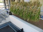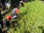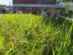 6月24日に田植えを行った学校の水田で稲が実りました。4組の児童が本日、収穫を行いました。鎌の安全な使い方に気を付けながら一人ひとり稲刈りをしました。