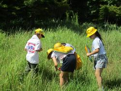 子どもたちは草むらの中や木の間などから虫を見つけていました。
