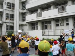通常の避難訓練は、校庭まで避難して人数確認を行いますが、総合防災訓練ではより安全な遊水池公園まで避難し、人数確認を行いました。その後、暑さ対策のために教室に戻ってからみんなで話を聞きました。