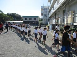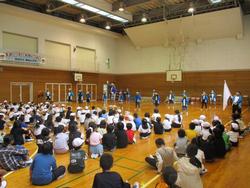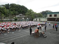 1年生から6年生までの全児童がそろって、快晴の空の下、校庭で朝会を行いました。