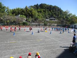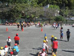 なかマイ競技のSの字リレーでは、異学年で協力してリレーを行っていました。