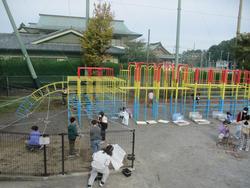 校庭にある遊具に紐をつかって結んだり、塔のように組み合わせたりした楽しい作品が出来上がりました。