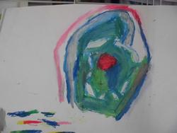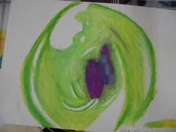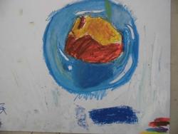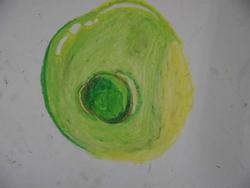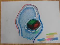 集めた油の表面、キラキラ・テカテカする螺鈿色の様子をクレパスで表現してみました。