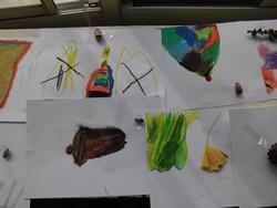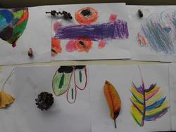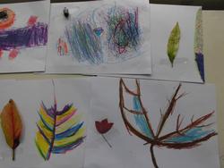 秋探しでみつけたものをじっーとみて、大好きなところをクレパスで描く活動をしました。