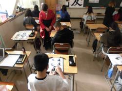 「春の海」という曲が流れた体育館の中で、子ども達は心を落ち着かせて、気持ちを入れて書いていました。