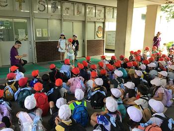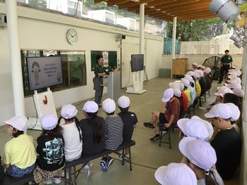 港南消防署の方から強い地震があったときの身の守り方を教えてもらい、起震車による震度6弱の地震を体験しました。子ども達は、強い揺れの中、自分の体を丸くすることがやっとでした。いつ来るか分からない地震ですが、今回学んだことを生かし、もしもの時の備えになることを期待しています。