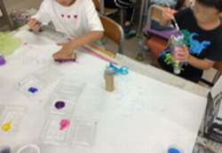・3年1組では、総合的な学習の時間に「シャボン玉」をテーマ(材)として学習を進めています。前回のシャボン玉作りを踏まえ、今度は自分たちでシャボン玉の液を作りたい」という思いから、いろいろなものを組み合わせて液を調合しました。暑さ対策もしながら、手にはストップウォッチをもちシャボン玉が何秒間跳び続けたのか、10回中何回成功するのか…などを記録していました。また、モールとひもを使いながらどちらの方がシャボン玉を飛ばすのに適しているのかを検証していました。大きなシャボン玉が飛ぶと、周囲から歓声がわき「モール?ひも?」と互いに聞き合う姿が見られ、学習に向かう子どもたちの熱を感じました。