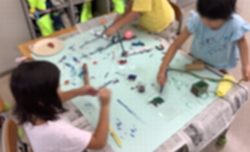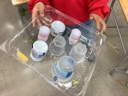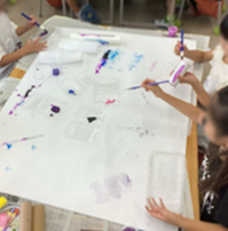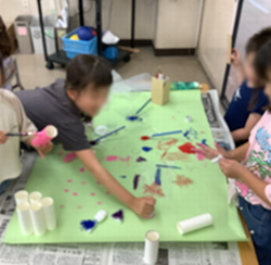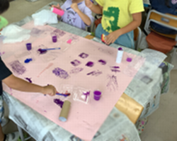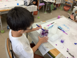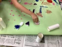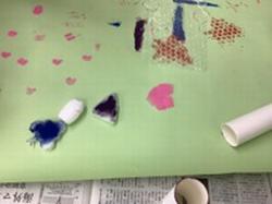 ・今日の図工では、容器に色を塗り、それを使って模造紙に絵を表現する活動をしました。卵パック、ペットボトルと様々なように、多様な色を塗るとたちまちカラフルなデザインに仕上がりました。偶然できた形を表現する中で仲間とその表現を楽しむ創造的な活動となりました。
