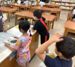 ・今日は、図書館へ行きました。まず学校司書に読み聞かせをしてもらいました。次に、自分の関心がある本を探し、読みました。虫や乗り物の図鑑、絵本など多岐にわたる本を手にして、集中して読書をしました。あっという間に終わりの時間となると「本を借りたい人はいますか。」の問いに、嬉しそうに本を借りる子どもたち。これからも、たくさんの本に触れ読書を楽しんでほしいです。