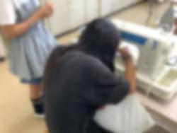 ・いよいよミシン実習となりました。昨年度学んだことを生かし、グループで協力しながらミシン針に糸を通したり、ボビンをセットしたりしました。「完成させて修学旅行へ持っていく。」と思いを膨らませていました。