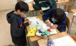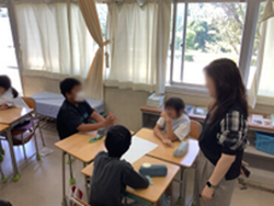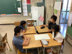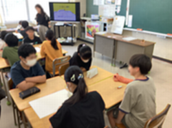 ・近隣施設の方の協力を得て、ファームの一部を4年1組が考える「憩いの場」にさせていただけることとなりました。今回の授業では、憩いの場を作るために、これから自分たちがやるべきことについて話し合いました。「自然に合うテーブルやいすを置きたい。」「焼き物を置いたら良い雰囲気になる。」という意見に対し、「テーブルが風で飛ばないようにしないといけない。」「テーブルの脚を左右揃えないと。」「坂になっているから考えて置かないと。」など具体的な意見が次から次へと出てきました。最終的には、施設の方の思いを聞いたり、完成図や設計図を作ったりしようという子どもたちの思いで話し合いがまとまりました。大好きな地域のために、自分たちにできることを真剣に考える子どもたちの目がとても力強かったです。