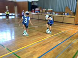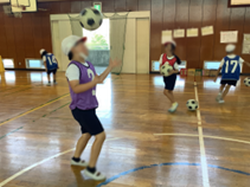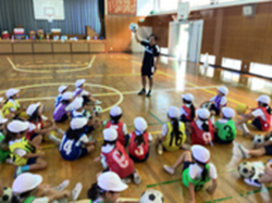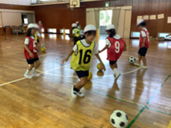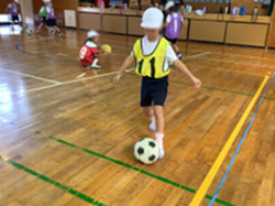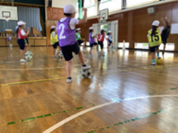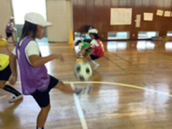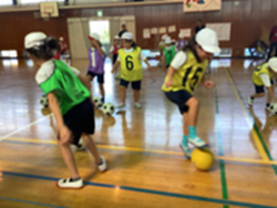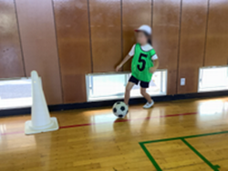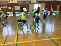 ・マリノスの方を講師にお招きして今日は、サッカーについて学習をしました。最初は、足でボールを止める、蹴るという練習をしました。講師の方は簡単そうに次から次へと技を披露してくださいました。子どもたちも、「ボールを止める時は足の裏。」といいながら、仲間と声をかけ合い一生懸命ボールと友達になろうとしていました。少しずつボールを動かすことにも慣れてくると、複雑な動きにも挑戦しました。運動を楽しむことを教わる機会となりました。