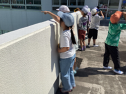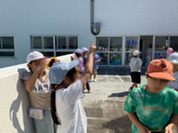 ・仲間と影の位置を確認すると、「太陽はこっちから、あっちへ動いているんだよ。」と対話から自分たちで学びを深めていました。