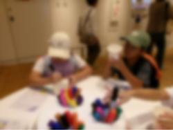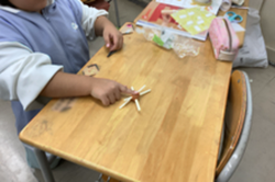 ・今日は紙粘土に色を付けながら一人ひとりが思い描く制作物を作りました。貯金箱、鉛筆立てといった実用的な物を作っていました。「この色は、〇と〇を混ぜて作りました。」「これは…。」と自分の作った作品を上手に説明する姿から、自信をもち楽しんでいる様子が伝わってきました。