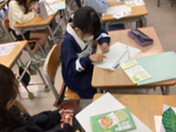 ・一人ひとりが育てている夏野菜の葉っぱの数を数えたり、においをかいだり、手触りを確かめたりしながら熱心に観察をしました。その後、成長の様子についてみんなで話し合いました。グループディスカッションでは、仲間の育てた野菜の成長を確かめたり、さらに成長していくために必要なことを考えたり、実が途中で育たなくなった原因について話し合ったりしました。授業が終わると、本で調べを進めようとしたり、仲間に野菜の成長を称賛されたことを喜んだりしている姿が見られました。一人ひとり自分が育てている野菜に名前をつけて愛着をもっている姿が参観者の心を打ちました。野菜の成長に比例して、さらに子どもたちが成長していく姿が目に浮かびます。