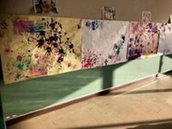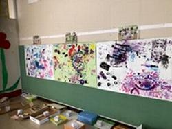 ・図工の時間に模造紙に一人ひとりが手を使ってアート作品を制作しました。模造紙いっぱいに描かれた作品に魅了されました。2階ホールに掲示してありますので、ご来校の際はご覧ください。