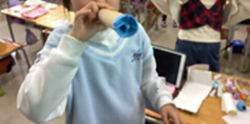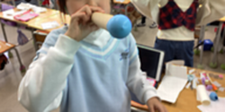 子どもたちのおもちゃ作りには、遊び心が満載でした。こちらの作品は、空気を入れると膨らみます。もちろん、空気を抜くと縮みます。こうした工夫が、見る人の心を愉快にさせます。