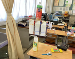 ・今日は、ロング昼休みでした。昨日図工の時間に作った作品を2階ホールに展示しました。すると、多くの1年生が集まって自分の作品を持って動かしたり、友達と見せ合ったりしていました。自分たちの作品に深い思いが入っていることが伝わってきました。