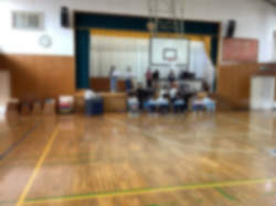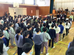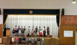 ・全校で体育館に集まって前期終業式をしました。全校を代表して6年生がこの半年間で成長したこと、後期に頑張りたいことをスピーチすると、会場から大きな拍手が送られました。
