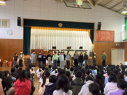 ・8:20より全校が体育館へ集まって学援隊の皆様に「よろしくお願いします。」の気持ちを伝える会を行いました。1・6年生代表児童の言葉では、「いつも見守ってくれてありがとうございます。」「これからもよろしくお願いします。」と全校の代表として堂々と伝えました。会の途中には、感謝の気持ちを込めて全校児童で校歌を歌い、歌のプレゼントを贈りました。