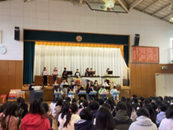 ・全校で体育館に集まり、2~6年生が1年生へ歌のプレゼントをしたり、学校のことを説明したりしました。最後に、1年生一人ひとりが名前を言い終えると、体育館に温かい拍手が送られました。