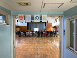 ・閉校式に向けて有志実行委員が準備を進めています。今日は、朝会でスローガンを発表しました。全校みんなで「特心楽笑」といって気持ちを一つにしました。