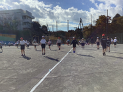 ・次に各クラスで長縄に挑戦しました。事前に決めた各クラスの目標回数を上回るために、気合いを入れて練習を始める各クラス。そして迎えた本番。「始めます。」とアナウンスが流れると、3分間の長縄が始まりました。「1,2,3…。」と、どのクラスも大きな声で数をかぞえ始めました。3分間どのクラスも元気いっぱい、一生懸命跳んでいる姿が輝いていました。