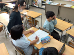 ・「明日は、遠足ですね。みなさん楽しみですか。これから、明日の遠足について説明をします。」と頼りがいのある言葉で説明が始まりました。実は、室ごとに分かれて、6年生が中心となって明日の遠足の打ち合わせをしました。しおりを使いながら、1~5年生にとって必要なことをメモするように伝えたり、全員がメモを取れているかサポートしたり、「分からないことがあったらいつでも質問してね。」と優しく投げかけたりしながら、リーダーとしてのしたたかさだけでなく、しなやかさも併せ持って進行する6年生。