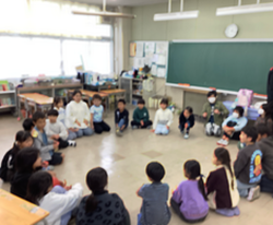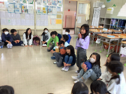 ・明日の遠足の説明を終えると、グループごとに輪となり、自己紹介をし合いました。一人ひとり、自己紹介を済ますと温かい拍手が送られました。